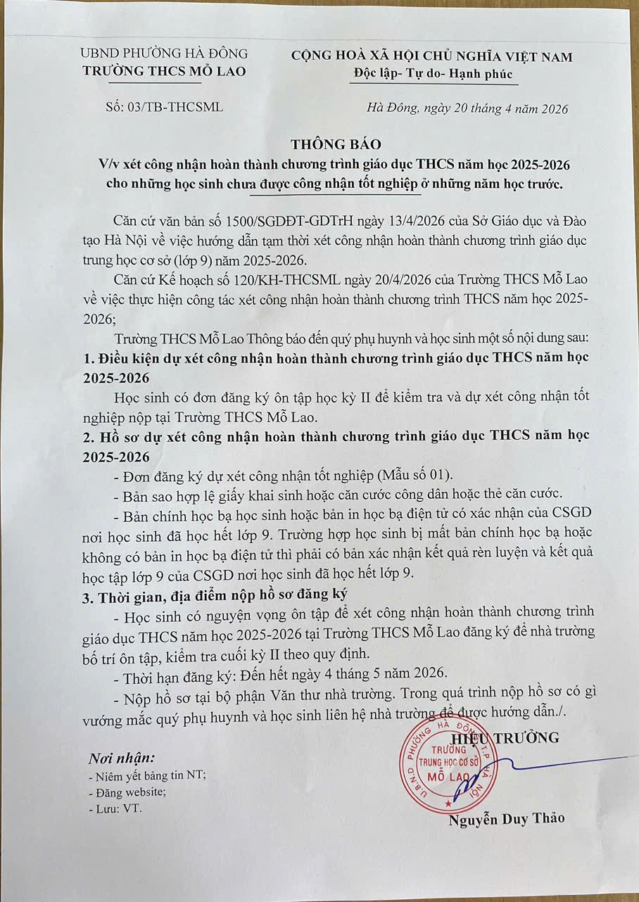 Thông báo: V/v xét công nhận hoàn thành chương trình giáo dục THCS năm học 2025–2026 cho học sinh chưa được công nhận tốt nghiệp ở các năm trước