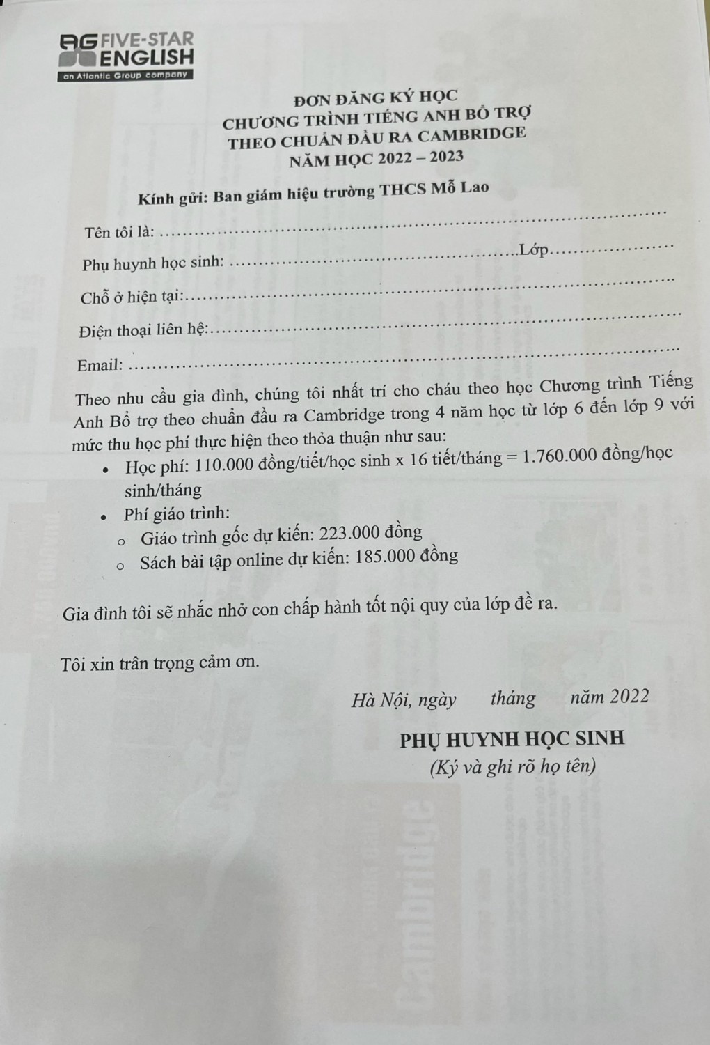 Chương trình " Tiếng Anh bổ trợ theo chuẩn đầu ra CAMBRIDGE tại trường THCS Mỗ Lao năm học 2022-2023